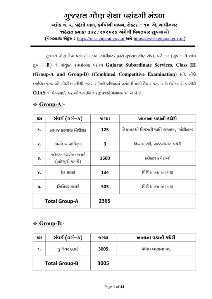 ગાંધીનગર: ગુજરાતના યુવાનો જેની લાંબા સમયથી રાહ જોઈ રહ્યા હતા, તે ગુજરાત ગૌણ સેવા પસંદગી મંડળ (GSSSB) દ્વારા વર્ગ-૩ (ગ્રુપ-A અને ગ્રુપ-B) ની વિવિધ જગ્યાઓ માટેની જાહેરાત (ક્રમાંક: ૩૭૮/૨૦૨૫૨૬) પ્રસિદ્ધ કરી દેવામાં આવી છે. આ ભરતી પ્રક્રિયા દ્વારા રાજ્યના વિવિધ વહીવટી વિભાગોમાં કુલ ૫,૩૭૦ જગ્યાઓ ભરવામાં આવશે.